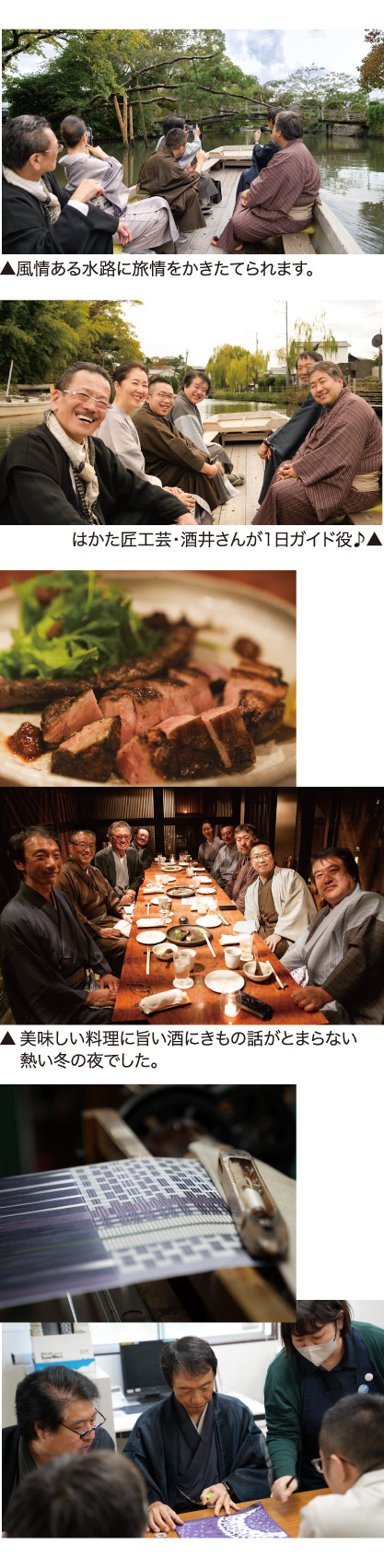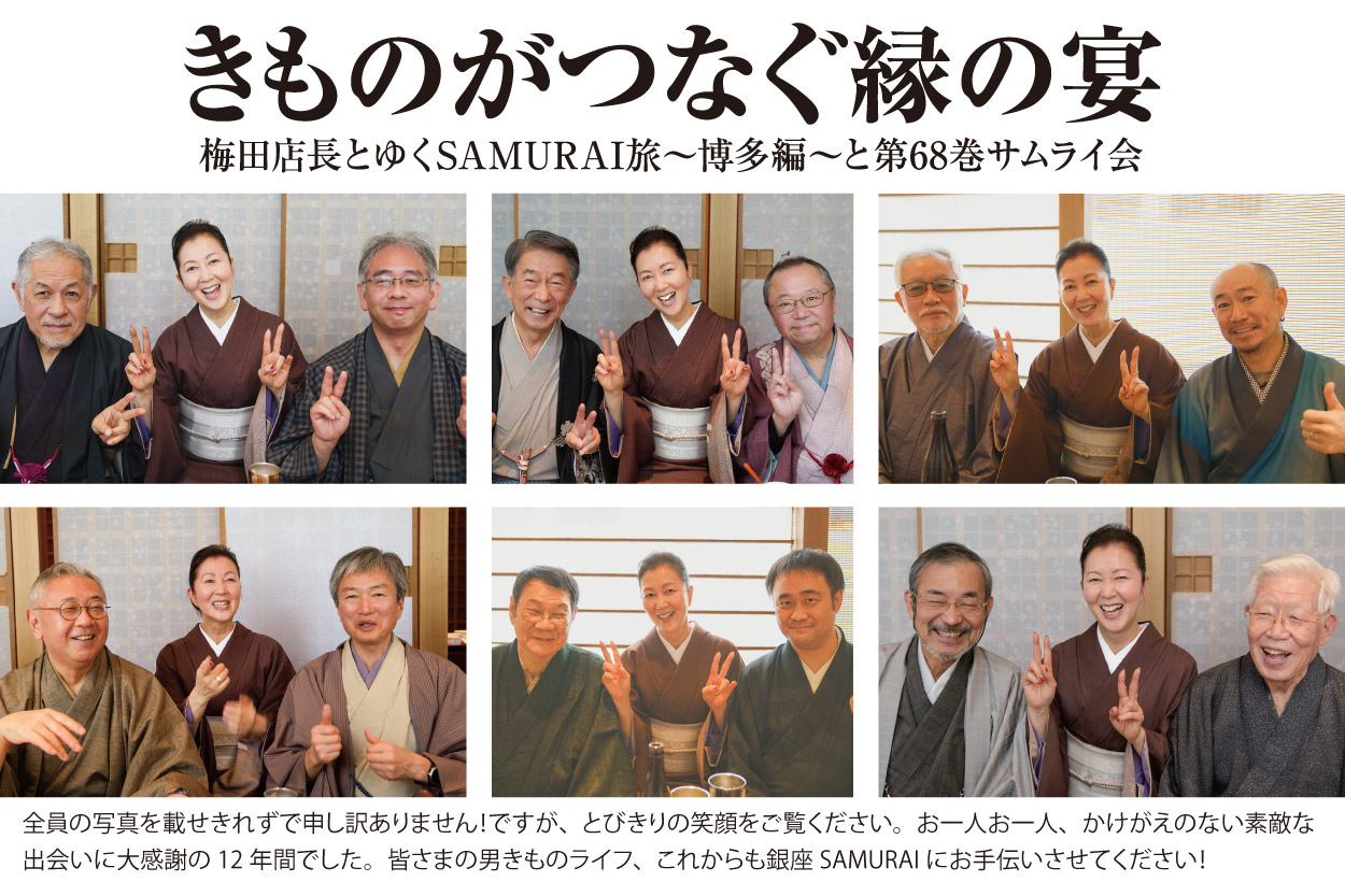 夕食は梅田店長オススメの大人の隠れ家的レストラン「IMURI」へ。NPO「きものを世界遺産にするための全国会議」の吉田理事長も駆けつけてくださり、博多の夜は楽しく更けてゆきました。翌日は、はかた匠工芸の工場見学へ。シャンシャンと鳴り響く機の音、華やかな佐賀錦や、手織りの博多帯が出来上がる様子に、皆さま目がキラキラされていました。職人さんのお話と一期一会の作品にご縁を感じお買い求めいただいた方も多く、皆さまに喜んでいただけた福岡の旅でした。師走はいよいよ、梅田店長勇退ということで12年間の感謝も込めて打ち上げ忘年会のサムライ会。節目の宴には、きものに似合う洗練された和食をと堪能していただきました。ひと皿進むごとに杯を交わし、皆さまと梅田店長の思い出話やきもの談義に華が咲き笑いがこぼれるほどに、心がほっこりと満たされてゆく時間。改めて、SAMURAIメンバーの皆さま、男きもの産地の皆さま、たくさんのご縁あっての銀座SAMURAIと実感いたしました。師走のお忙しい中をお集まりいただきました皆さまに、心より感謝申し上げます。
