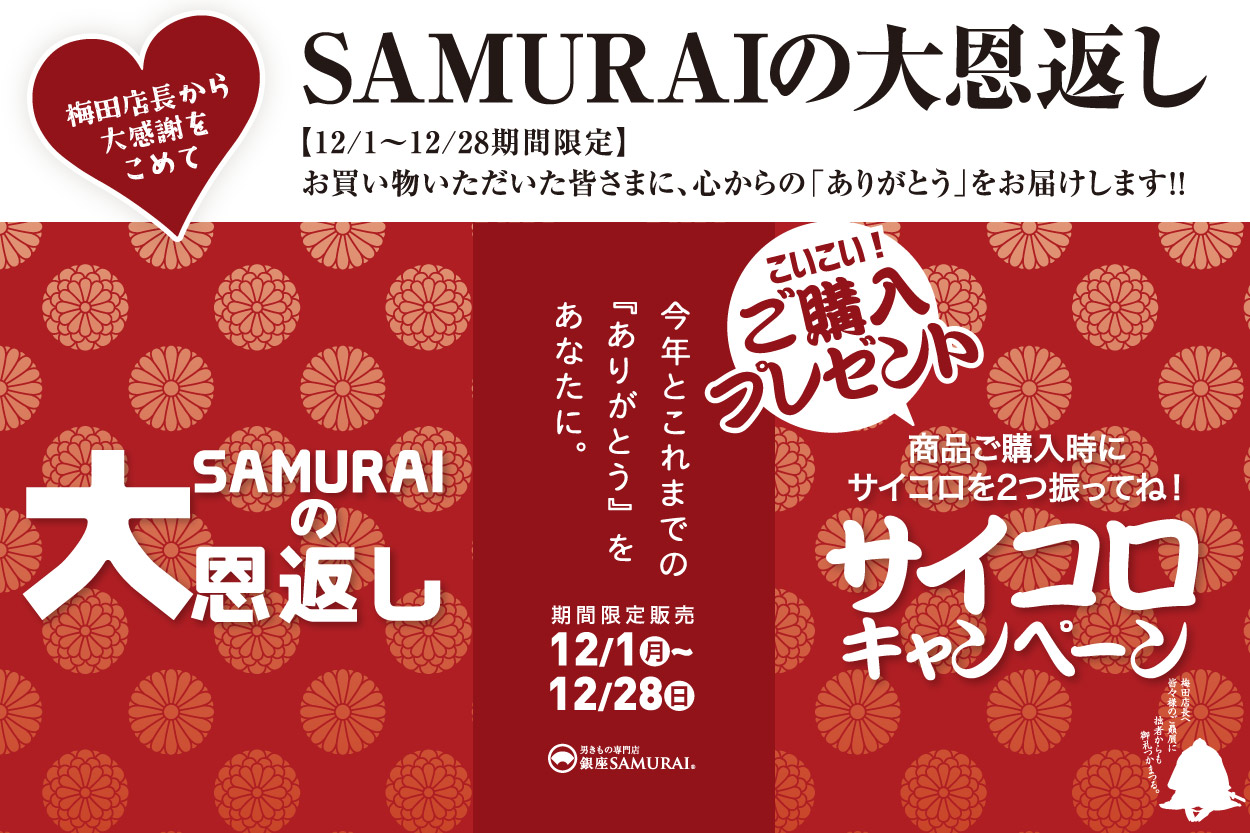 今年はご購入時に2つのサイコロを振って、出目の合計に応じて豪華プレゼントが当たる『サイコロキャンペーン』。気になるプレゼント品は、大人気の角帯「匠帯」をはじめ、選りすぐりの反物、オーダーメイド草履など豪華商品をご用意中。ハズレのご用意はありません(笑)さてさて、何が出るかはお楽しみ♪きものシーズンのお買い物は、ぜひ銀座SAMURAIで。